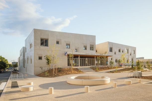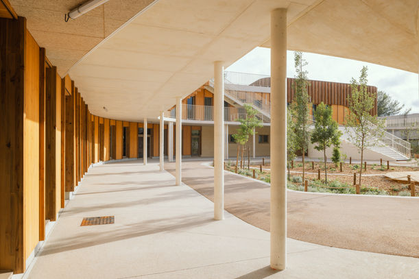 Sur l’ancien stade de la Mosson renaît le groupe scolaire Hypatie, un véritable parc habité pensé pour les enfants. Derrière son enveloppe sobre et protectrice, l’intérieur révèle des espaces généreux, lumineux et chaleureux. Bois, paille, béton bas carbone et terre crue composent une architecture durable, construite en seulement 15 mois. Les cours de récréation s’étagent sur plusieurs niveaux, offrant aux enfants un terrain de jeu propice à la créativité et à la découverte.